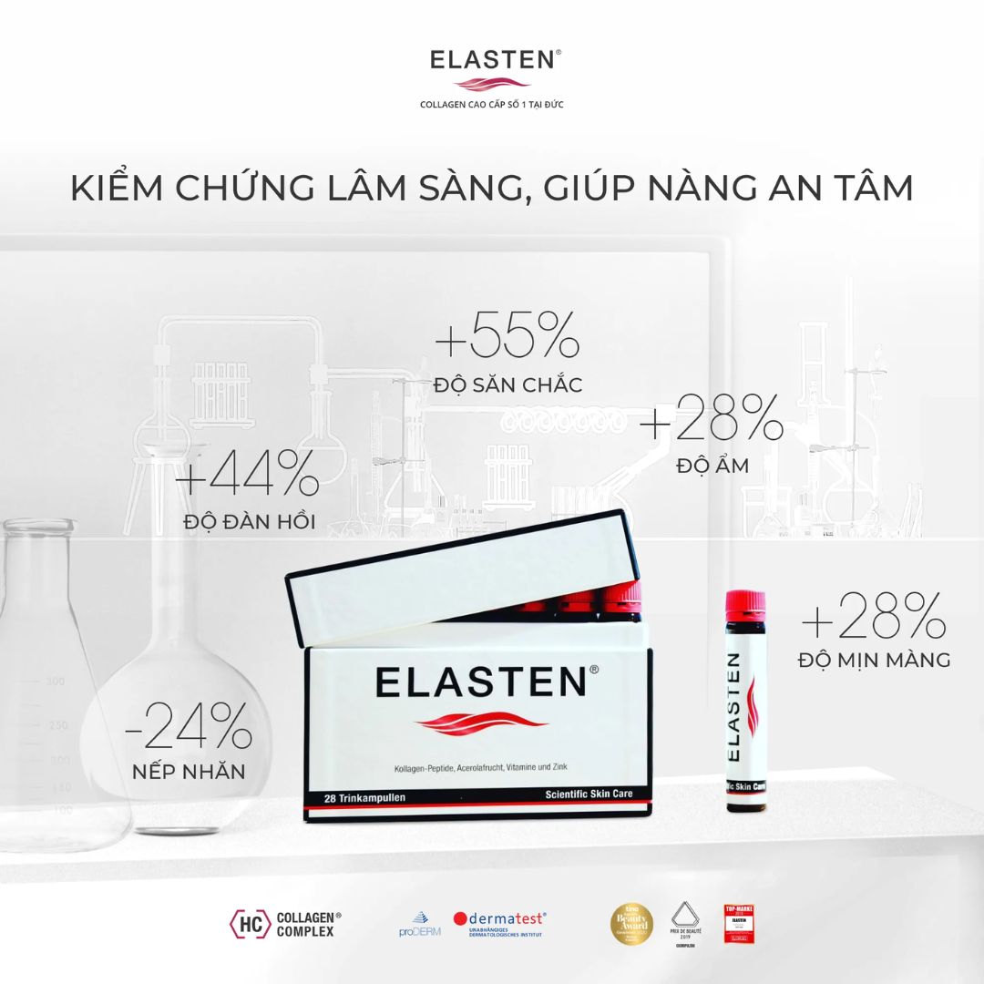 ELASTEN® là sản phẩm collagen dạng uống được mệnh danh là collagen bán chạy số #1 tại Đức trong nhiều năm. Sản phẩm được phát triển bởi Quiris Healthcare – công ty dược phẩm hàng đầu tại Đức – với mục tiêu hỗ trợ làm đẹp toàn thân, mang lại vẻ ngoài rạng rỡ, đẹp tự nhiên và tươi sáng hồng hào hơn.