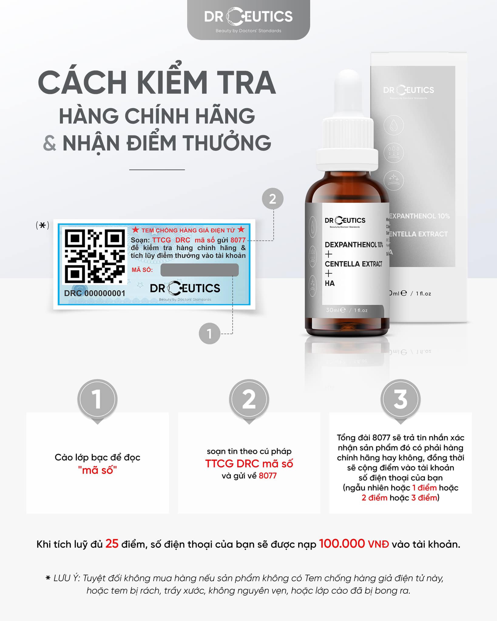 Tem điện tử chống hàng giả là điểm sáng giúp bảo vệ người tiêu dùng cũng như quyền lợi của các Đối Tác khi đồng hành cùng nhãn hàng DrCeutics