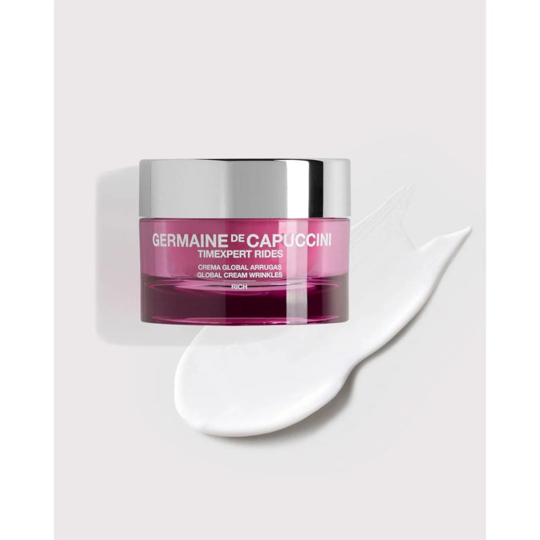 Germaine Timexpert Rides Global Cream Wrinkles Rich là dòng kem dưỡng trẻ hóa da chuyên sâu, ứng dụng công nghệ sinh học tiên tiến kết hợp cùng vi hạt cầu giúp tối ưu khả năng giữ ẩm, tái tạo tế bào và kích thích sản xuất collagen tự nhiên. Sản phẩm giúp làm đầy nếp nhăn từ bên trong, đồng thời bảo vệ da khỏi tác động của tia UV, mang lại làn da căng mịn và rạng rỡ sau 30 ngày sử dụng.