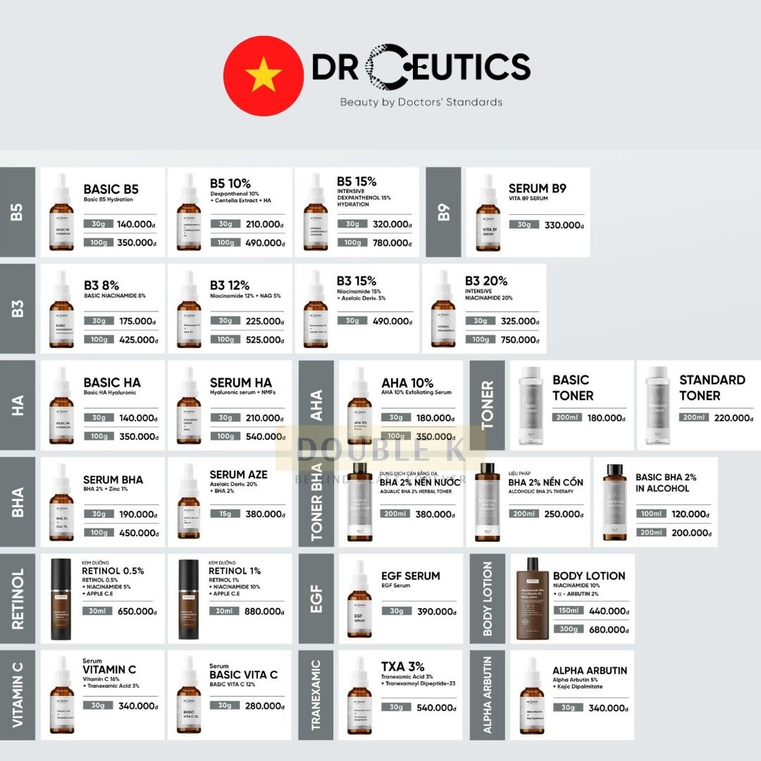 DrCeutics hiểu rằng mỗi người có nhu cầu da riêng biệt. Vì vậy, họ đã tạo ra một loạt các sản phẩm đa dạng và đa năng, từ kem dưỡng da hàng ngày đến các sản phẩm chuyên biệt, nhằm đáp ứng từng yêu cầu và mục tiêu làn da của bạn. Tất cả sản phẩm của DrCeutics đều được sản xuất theo tiêu chuẩn chất lượng cao nhất, đảm bảo tính an toàn và hiệu quả.