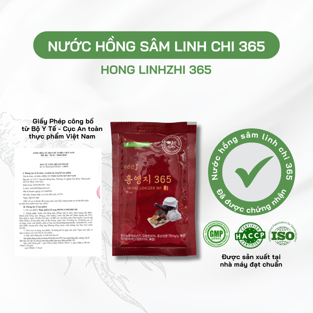 Nước Hồng Sâm Linh Chi Hàn Quốc Hong Linhzhi 365 là sự kết hợp hài hòa của hồng sâm 6 tuổi và linh chi Hàn Quốc cùng các vị thuốc quý có tác dụng trong việc bồi bổ sức khỏe, tăng khả năng miễn dịch, hỗ trợ giảm mệt mỏi, căng thẳng và hỗ trợ quá trình trao đổi chất, loại bỏ độc tố trong cơ thể.